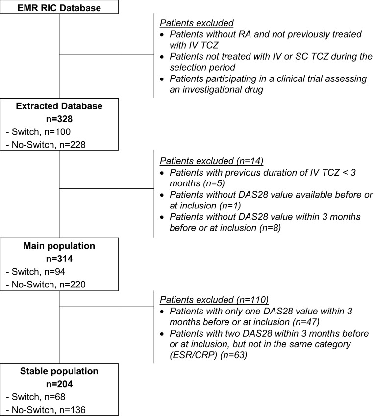 Methods: We analyzed all the RA patients of the shared medical file "RIC Nord de France", treated with tocilizumab, switching or not from intravenous to subcutaneous tocilizumab, between April 2015 and January 2016. The primary effectiveness endpoint was the proportion of patients remaining in their DAS28-ESR category remission/low disease activity (LDA) or moving to an inferior DAS28-ESR category at 6 months. Since RoSwitch was an observational study, without randomization, a propensity score was built in a sensitivity analysis to balance on RA and patients' characteristics at inclusion between switching and no-switching groups.