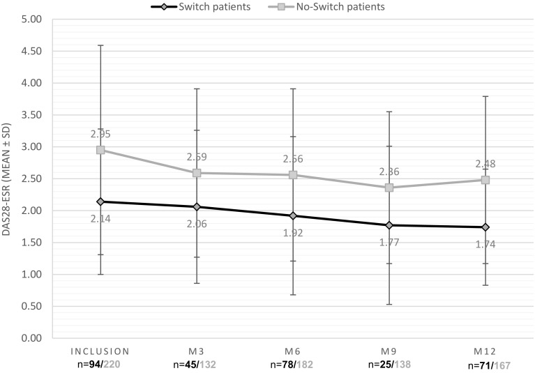 Results: An improvement of initial DAS28-ESR category or maintenance in DAS28-ESR remission/LDA at 6 months was shown in 203 of the 285 patients with an evaluation for the primary criterion (71.2%, 95% CI [65.6-76.4%]) without differences between groups (73.3%, 95% CI [63.0-82.1%] vs. 70.3%, 95% CI [63.3-76.6%]). The RoSwitch study showed the maintenance of effectiveness at 6 and 12 months. Similar therapeutic maintenance rates were observed for switch and no-switch patients. No clinical factor was associated with the switch in patients in remission/LDA at inclusion.