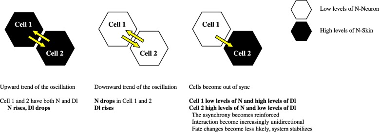 Conclusions: The signaling pathways within and between cells in our model interact in real time to create a spatially correct field of neurons and skin cells. This model predicts that cells with high N and low Dl drive the formation of the pattern. This model also be used to elucidate general rules of biological self-patterning and decision-making.
