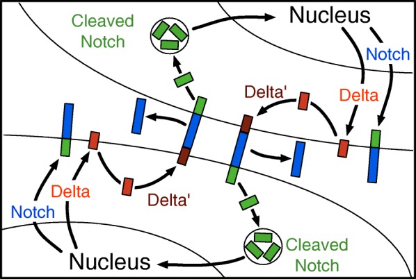 Background: The Notch signaling pathway is involved in cell fate decision and developmental patterning in diverse organisms. A receptor molecule, Notch (N), and a ligand molecule (in this case Delta or Dl) are the central molecules in this pathway. In early Drosophila embryos, these molecules determine neural vs. skin fates in a reproducible rosette pattern.