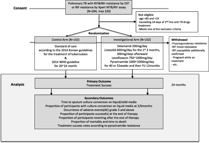 Methods: This study is a phase II/III, multicenter, randomized, open-label clinical trial of non-inferiority design comparing a new regimen to the World Health Organization-endorsed conventional regimen for fluoroquinolone-sensitive MDR-TB. The control arm uses a conventional treatment regimen with second-line drugs including injectables for 20-24 months. The investigational arm uses a new shorter regimen including delamanid, linezolid, levofloxacin, and pyrazinamide for 9 or 12 months depending on time to sputum culture conversion. The primary outcome is the treatment success rate at 24 months after treatment initiation. Secondary outcomes include time to sputum culture conversion on liquid and solid media, proportions of sputum culture conversion on liquid media after 2 and 6 months of treatment, treatment success rate according to pyrazinamide resistance, and occurrence of adverse events grade 3 and above as evaluated by the Common Terminology Criteria for Adverse Events. Based on an α = 0.025 level of significance (one-sided test), a power of 80%, and a < 10% difference in treatment success rate between the control and investigational arms (80% vs. 70%) when the anticipated actual success rate in the treatment group is assumed to be 90%, the number of participants needed per arm to show non-inferiority of the investigational regimen was calculated as 48. Additionally, assuming the proportion of fluoroquinolone-susceptible MDR-TB among participants as 50%, and 5% loss to follow-up, the number of participants is calculated as N/( 0.50 × 0.95), resulting in 102 persons per group (204 in total).