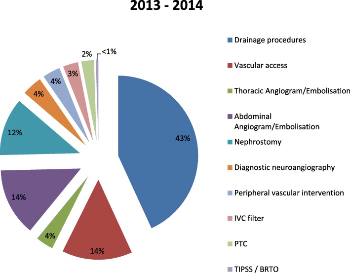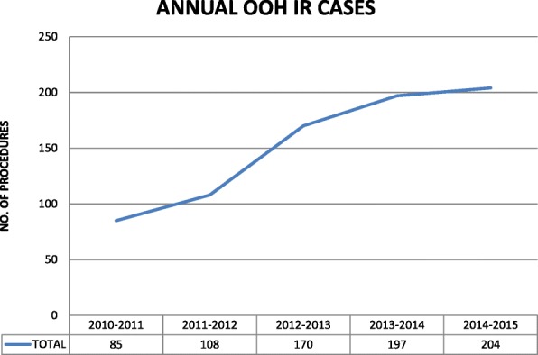 Results: Of the 7140 procedures performed by IR over the 5 years, 764 were out-of-hours. The total number of out-of-hours cases performed annually by IR has increased by 240% from year 1 to year 5. The variety and distribution of out-of-hours work has shown a characteristic trend with rising requests for advanced procedures such as active haemorrhage control.