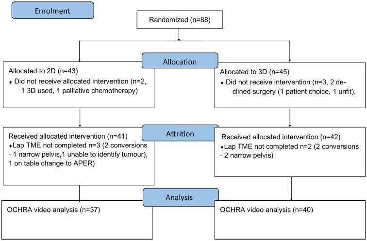 Methods: A multicentre developmental randomised controlled trial comparing 2D and 3D laparoscopic TME was performed (ISRCTN59485808). Trial surgeons were colorectal consultants that had completed their TME proficiency curve and underwent stereoscopic visual testing. Patients requiring elective laparoscopic TME with curative intent were centrally randomised (1:1) to 2D or 3D using Karl Storz IMAGE1 S D3-Link™ and 10-mm TIPCAM®1S 3D passive polarising laparoscopic systems. Outcomes were enacted adverse events as assessed by the observational clinical human reliability analysis technique, intraoperative data, 30-day patient outcomes, histopathological specimen assessment and surgeon cognitive load.