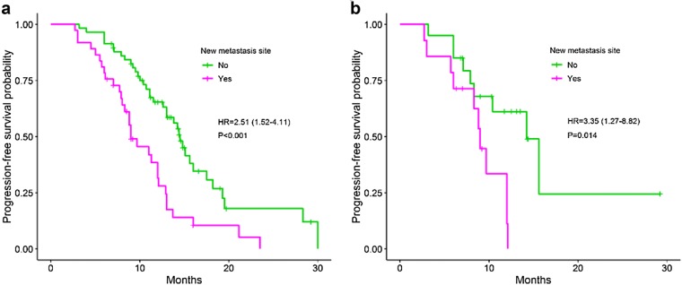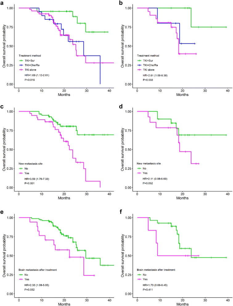 Results: Among 94 patients, 28 cases still are good responses according to the RECIST criteria and negative for EGFR mutations in plasma. Of 66 resistant patients, EGFR mutations were positive in plasma of 57 cases (86.4%) which was higher than the value of pre-treatment (48.5%). Of which, 17 patients (25.8%) have the occurrence of EGFR mutations in plasma earlier than progression 2.1 (0.6-7.9) months. The secondary T790M mutation was found in the plasma of 32 cases (48.5%). Median PFS and OS for the study subjects were 12.9 (11.0-14.2) and 29.5 (25.2-41.3) months, respectively. The post-treatment EGFR plasma test with brain and new metastasis were detected as independent prognostic factors for worse PFS (P = 0.008, 0.016 and 0.028, respectively). While EGFR plasma (P = 0.044) with bone metastasis at baseline (P = 0.012), new metastasis (P = 0.003), and high cfDNA concentration (P = 0.004) serve as the worse survival factors, surgery treatment helps to prolong OS in NSCLC treated with EGFR TKI (P = 0.012). BMA analysis identified EGFR plasma test as the strongest prognostic factor for both PFS and OS (possibility of 100% and 99.7%, respectively).