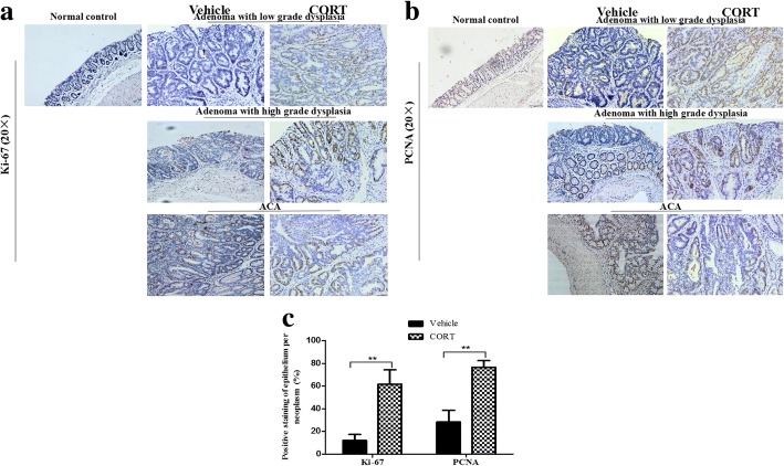 Results: CORT feeding in drinking water of mice not only significantly elevated plasma CORT concentration, but also significantly increased the incidence and neoplasms burden (number and size of neoplasms) in colorectum. CORT also significant enhanced the expression of cell proliferation marker (Ki-67 and PCNA), NF-κB p65 and P-p65 as well as COX-2 in colorectal neoplasm of AOM/DSS-treated mice.