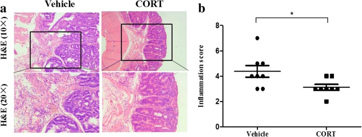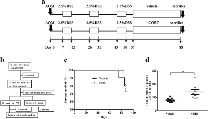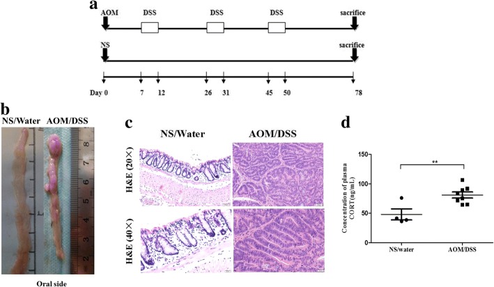 Methods: We evaluated the effect of corticosterone (CORT) on azoxymethane and dextran sulfate sodium (AOM/DSS)-induced carcinogenesis in the colorectum of C57BL/6 strain mice. Plasma level of CORT was detected by radioimmunoassay. The expression of proliferation markers (Ki-67 and PCNA), nuclear factor (NF)-κB p65 and phosphoto-p65 (P-p65), as well as cyclooxygenase (COX)-2 were determined by immunohistochemistry. Inflammation in colorectum was evaluated by histopathology.