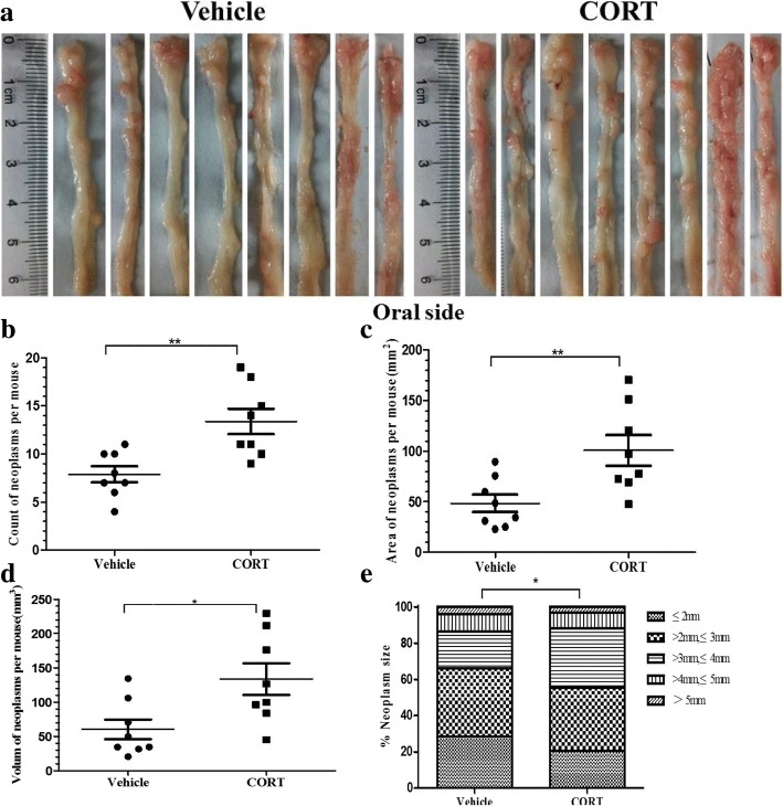 Conclusion: In this study, we have found for the first time that CORT at stress level potentially promotes the growth and development of AOM/DSS-induced colorectal adenoma and carcinoma in mice. Up-regulation of NF-κB and COX-2 may be involved in the promoting effect of CORT.