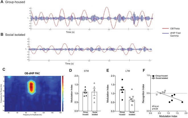 The absence of companion may jeopardize mental health in social animals. Here, we tested the hypothesis that social isolation impairs social recognition memory by altering the excitability and the dialog between the olfactory bulb (OB) and the dorsal hippocampus (dHIP). Adult male Swiss mice were kept grouped (GH) or isolated (SI) for 7 days. Social memory (LTM) was evaluated using social recognition test. SI increased glutamate release in the OB, while decreased in the dHIP. Blocking AMPA and NMDA receptors into the OB or activating AMPA into the dHIP rescued LTM in SI mice, suggesting a cause-effect relationship between glutamate levels and LTM impairment. Additionally, during memory retrieval, phase-amplitude coupling between OB and dHIP decreased in SI mice. Our results indicate that SI impaired the glutamatergic signaling and the normal communication between OB and HIP, compromising the persistence of social memory.