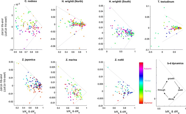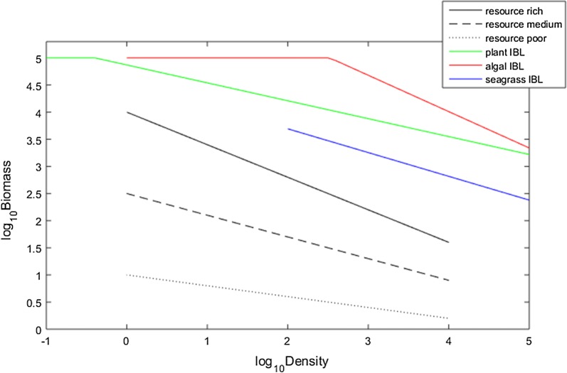 Results: to comply with this new paradigm, we developed a seagrass growth model that updates the carrying capacities for biomass and shoot density from the seagrass IBL at each time step. The use of a joint biomass and density growth rates enabled parameter estimation with twice the sample sizes and made the model less sensitive to episodic error in either of the variables. The use of instantaneous growth rates enabled the model to be calibrated with data sampled at widely different time intervals. We used data from 24 studies of six seagrass species scattered worldwide. The forecasted allometric biomass-density growth trajectories fit these observations well. Maximum growth and decay rates were found consistently for each species. The growth rates varied seasonally, matching previous observations.