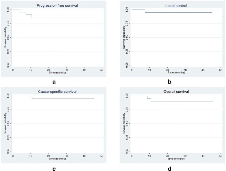 Results: Thirty-one patients (20 males and 11 females) with a median age of 71 (50-80) years were enrolled with a median follow-up time of 12.1 (2.9-45.2) months. Fourteen were adenocarcinomas, 7 squamous cell carcinomas, 4 non-specified NSCLC and 6 had no histological diagnosis (4/6 had previous resected lung cancer). The median tumor size was 3.1 (1.1-4.7) cm. No grade 4-5 toxicities were observed. One patient experienced grade 3 (per the Common Terminology Criteria for Adverse Events version 4.03) radiation-induced lung injury (RILI) at 6.7 months from radiation started. Grade 2 acute toxicities included hematological toxicities (5 cases), RILI (2), plural pain (1) and dermatitis (1). Grade 2 late toxicities included RILI (3) and asymptomatic rib fracture (1). Three patients had progressed disease at 4.0~10.6 months after the initiation of PT. One experienced local failure with simultaneous distant failure and died of brain metastasis at 10.8 months; one developed regional and distant failure and died of lung infection at 8.7 months; the other experienced isolated distant failure only and his disease was well controlled after salvage systemic therapy. The estimated rates of progression-free survival, local control, cause-specific survival and overall survival at 1, 2 years were 85.5% and 85.5%, 95.2% and 95.2%, 95.0% and 95.0%, 90.7% and 90.7%, respectively.