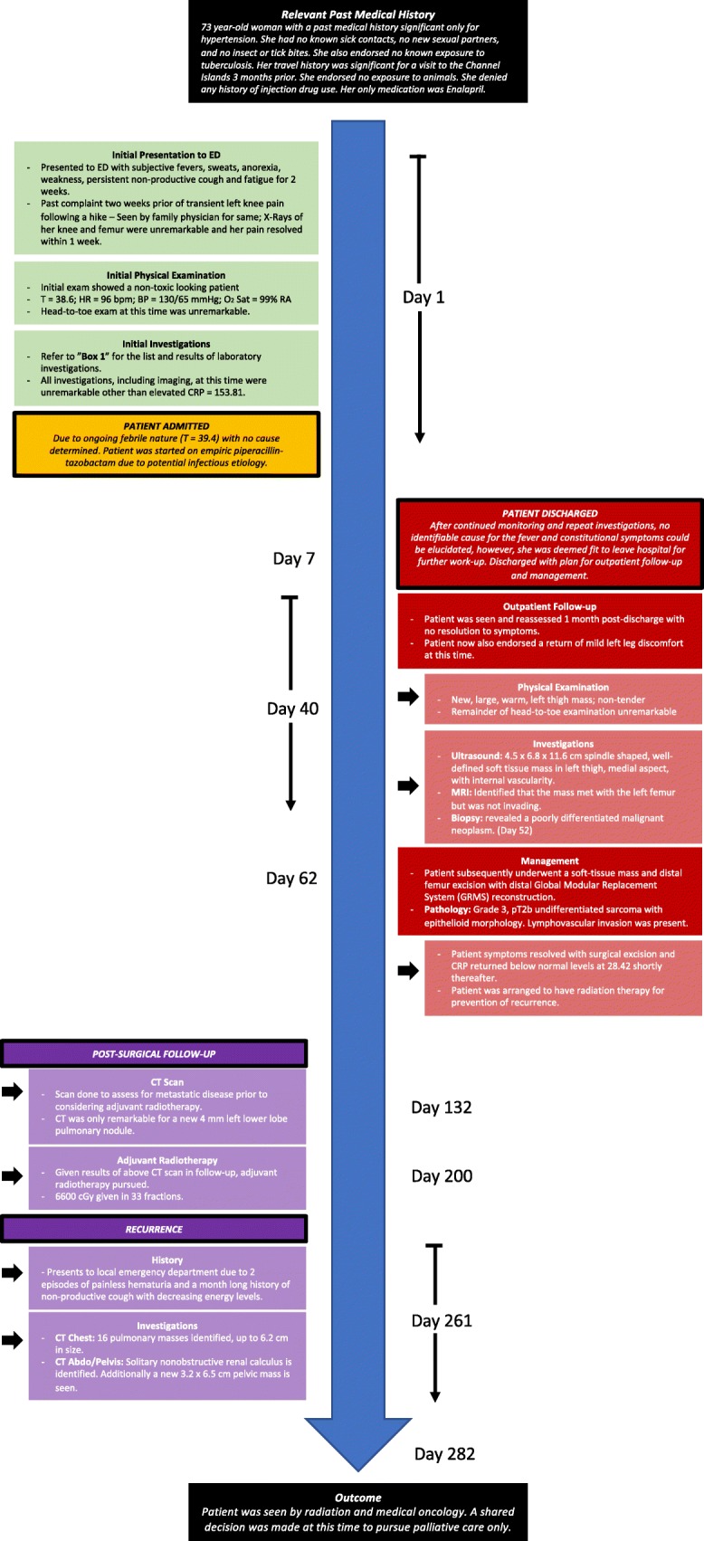 Case presentation: A 73-year-old Caucasian woman presented with a 2-week history of fever and profound fatigue. The only other symptom she endorsed was a transient history of left knee pain, initially thought to be unrelated. There was no clear cause on initial examination and routine investigations, but her C-reactive protein was significantly elevated at 207 mg/L. Blood cultures and a urine culture were drawn. She was admitted to hospital for further investigation and placed on empiric antibiotics. Her blood cultures were negative, but she had one further fever in hospital. Computed tomography scans did not yield a cause of her fever. No vegetations were seen on echocardiography. Antibiotics were stopped as she did not seem to have an acute infectious cause of her fever. No new symptoms developed. She felt well enough to proceed with out-patient follow up and was discharged after 8 days in hospital. At 1-month post-discharge: no resolution of symptoms, but she endorsed a recurrence of her left knee pain. Ultrasound and magnetic resonance imaging revealed a 4.5 × 6.8 × 11.6 cm soft tissue mass, identified as a sarcoma on biopsy. She subsequently underwent a distal femur resection. Final staging was pT2bN0M0. She underwent adjuvant radiation therapy, but was found to have developed metastatic disease.