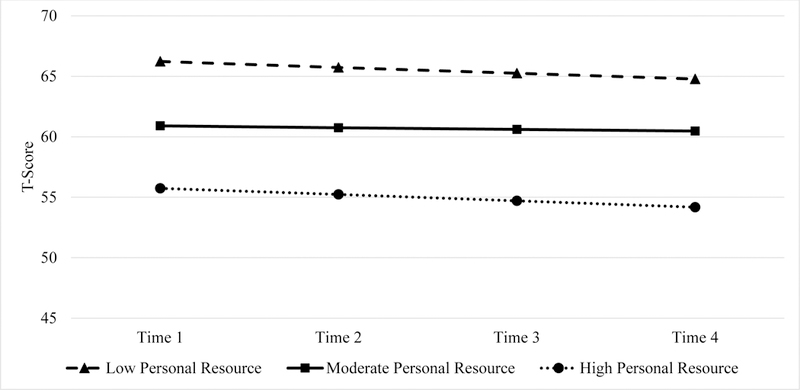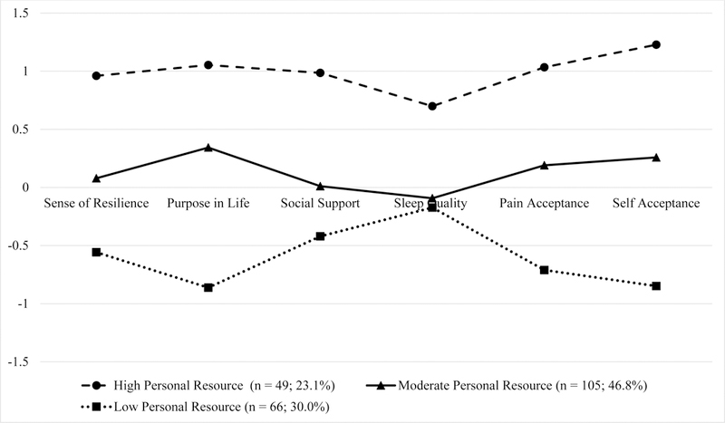 Results: Three subgroups were identified in both studies: High, Moderate, and Low Personal Resource groups. In both studies, annual income level was significantly different among subgroups. Study 1 results showed a significant between-groups difference in pain interference across 21-days only between High and Moderate Personal Resource groups controlling for the level of pain intensity and depressive symptoms. In Study 2, however, all subgroups were significantly different with respect to their levels of pain interference at baseline over and above various covariates, with the Low Personal Resource group reporting the highest level of pain interference at baseline. These baseline differences remained stable over 4 years.