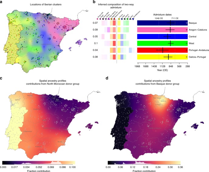 The Iberian Peninsula is linguistically diverse and has a complex demographic history, including a centuries-long period of Muslim rule. Here, we study the fine-scale genetic structure of its population, and the genetic impacts of historical events, leveraging powerful, haplotype-based statistical methods to analyse 1413 individuals from across Spain. We detect extensive fine-scale population structure at extremely fine scales (below 10 Km) in some regions, including Galicia. We identify a major east-west axis of genetic differentiation, and evidence of historical north to south population movement. We find regionally varying fractions of north-west African ancestry (0-11%) in modern-day Iberians, related to an admixture event involving European-like and north-west African-like source populations. We date this event to 860-1120 CE, implying greater genetic impacts in the early half of Muslim rule in Iberia. Together, our results indicate clear genetic impacts of population movements associated with both the Muslim conquest and the subsequent Reconquista.