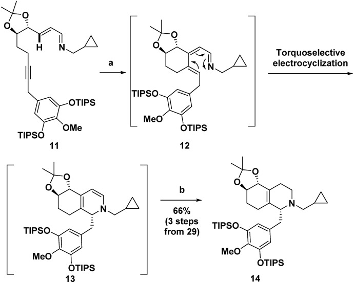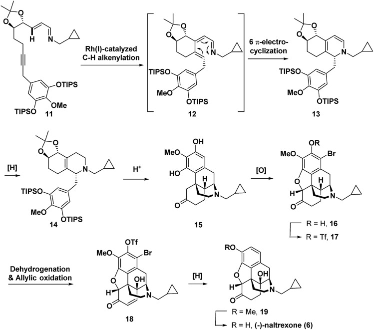 (-)-Naltrexone, an opioid antagonist used extensively for the management of drug abuse, is derived from naturally occurring opioids. Herein, we report the first asymmetric synthesis of (-)-naltrexone that does not proceed through thebaine. The synthesis starts with simple, achiral precursors with catalytic enantioselective Sharpless dihydroxylation employed to introduce the stereogenic centers. A Rh(i)-catalyzed C-H alkenylation and torquoselective electrocyclization cascade provides the hexahydro isoquinoline bicyclic framework that serves as the precursor to the morphinan core. The acidic conditions used for Grewe cyclization not only provide the morphinan framework, but also cause a hydride shift resulting in the introduction of the C-6 oxo functionality present in (-)-naltrexone. The C-14 hydroxyl group is installed by an efficient two-step sequence of Pd-mediated ketone to enone dehydrogenation followed by C-H allylic oxidation using Cu(ii) and O2, a method that has not previously been reported either for the synthesis or semi-synthesis of opioids. The longest linear sequence is 17 steps, and because the stereogenic centers in the product rely on Sharpless asymmetric dihydroxylation, the route could be used to access either enantiomer of the natural product, which have disparate biological activities. The route also may be applicable to the preparation of opioid derivatives that could not be easily prepared from the more fully elaborated and densely functionalized opioid natural products that have traditionally served as the starting inputs.