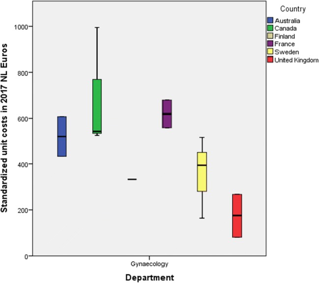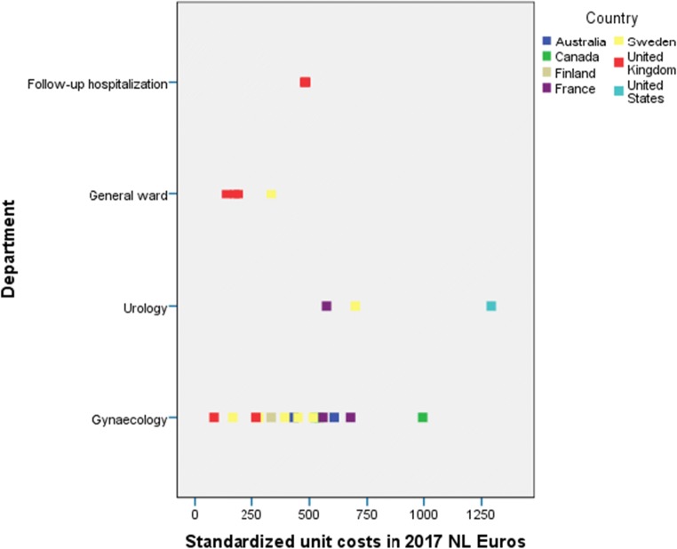 Results: We included 37 studies in this review. Four hundred and eighty-two cost estimates from 13 countries worldwide were extracted. Descriptive analysis shows that hospital stay in gynecology ranged between €82 and €1,292 per day. Costs of gynecological consultation range from €30 in France to €158 in Sweden. In the UK, costs are estimated at €228 per hour. Costs of a tension-free vaginal tape (TVT) device range from €431 in Finland to €994 in Canada. TVT surgery per minute costs €25 in France and €82 in Sweden. Total costs of TVT range from €1,224 in Ireland to €5,809 for inpatient care in France. Variation was explored.