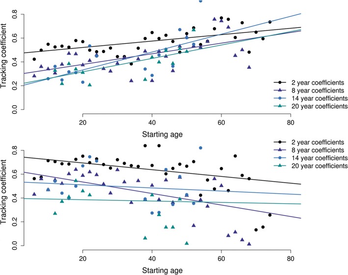 Results: Two-year tracking coefficients are moderate to high for total volume of exercise across ages at baseline, ranging from .38 to .77 with a median of .57. Tracking coefficients tend to decrease as the distance to follow-up increases, down to a median of .38 for the 22-year tracking coefficients. The patterns of tracking were largely domain-independent and were largely similar for solitary, competitive, non-competitive, externally and internally paced activities. With the exception of team-based activities, tracking was seen to increase as a function of baseline age. Cross-domain tracking did not favour any specific domain of exercise activity as the best predictor for total volume of exercise behaviour and this was true at all baseline ages.