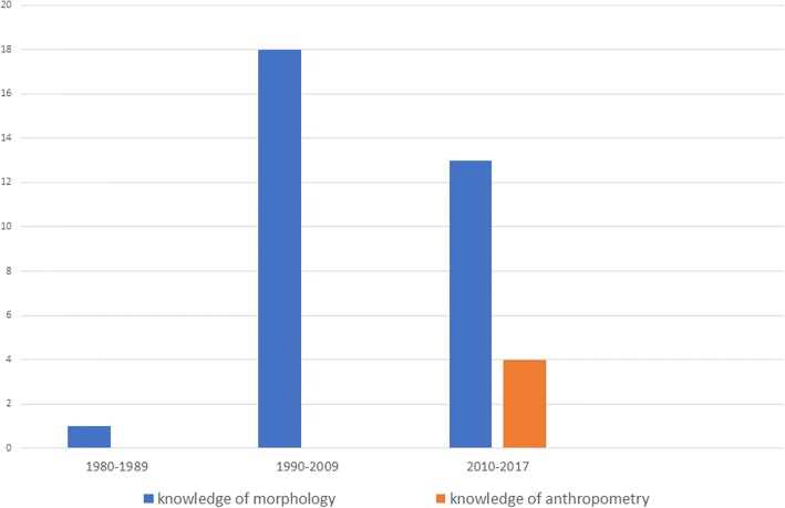Result: Thirty-three studies met the inclusion criteria. The majority of the studies included were conducted in middle-income countries (54.5%) and some in high-income countries (45.5%); none was recorded from low-income countries. The total available sample size from the studies was 120 with a dominant male population of 67 (55.8%) and female 53 (44.2%). The majority (97%) of the studies reported on the knowledge of morphology while 12.1% of the included studies reported on anthropometry. Of the 33 included studies, 32 scored the highest quality (76-100%) from the quality assessment.