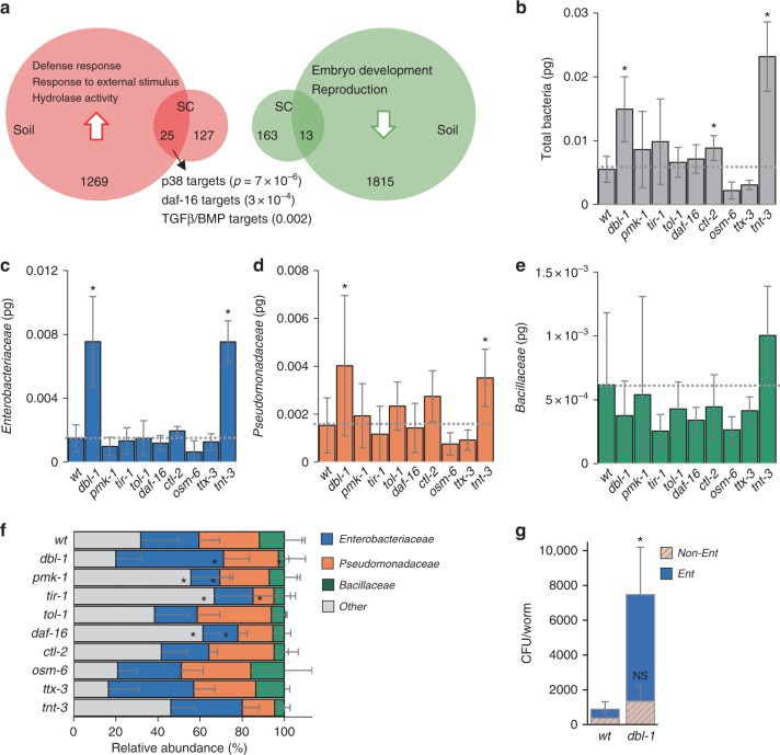 The gut microbiota contributes to host health and fitness, and imbalances in its composition are associated with pathology. However, what shapes microbiota composition is not clear, in particular the role of genetic factors. Previous work in Caenorhabditis elegans defined a characteristic worm gut microbiota significantly influenced by host genetics. The current work explores the role of central regulators of host immunity and stress resistance, employing qPCR and CFU counts to measure abundance of core microbiota taxa in mutants raised on synthetic communities of previously-isolated worm gut commensals. This revealed a bloom, specifically of Enterobacter species, in immune-compromised TGFβ/BMP mutants. Imaging of fluorescently labeled Enterobacter showed that TGFβ/BMP-exerted control operated primarily in the anterior gut and depended on multi-tissue contributions. Enterobacter commensals are common in the worm gut, contributing to infection resistance. However, disruption of TGFβ/BMP signaling turned a normally beneficial Enterobacter commensal to pathogenic. These results demonstrate specificity in gene-microbe interactions underlying gut microbial homeostasis and highlight the pathogenic potential of their disruption.