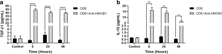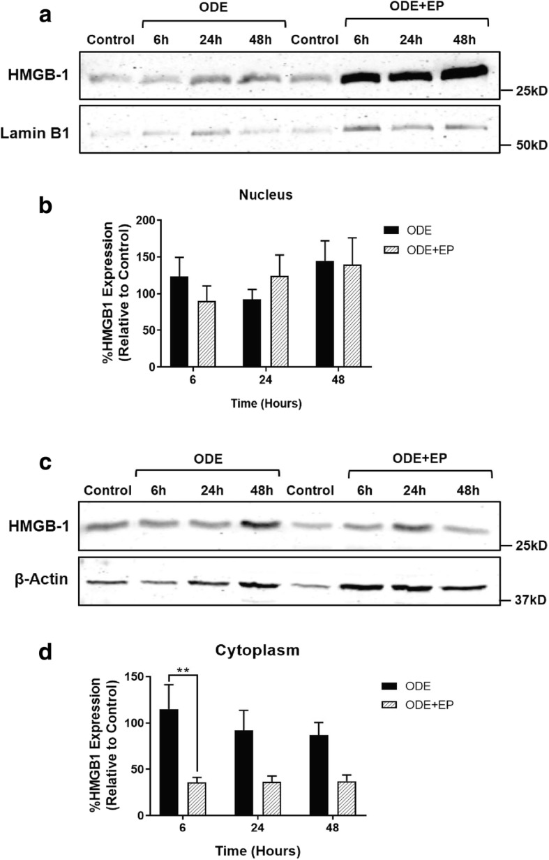 Results: Compared to controls, barn exposed rats showed an increase in the expression of HMGB1 in the lungs. Compared to controls, ODE exposed BEAS-2B cells showed nucleocytoplasmic translocation of HMGB1, co-localization of HMGB1 and RAGE, reactive species and pro-inflammatory cytokine production. EP treatment reduced the ODE induced nucleocytoplasmic translocation of HMGB1, HMGB1 expression in the cytoplasmic fraction, GM-CSF and IL-1β production and augmented the production of TGF-β1 and IL-10. Anti-HMGB1 treatment reduced ODE-induced NF-κB p65 expression, IL-6, ROS and RNS but augmented TGF-β1 and IL-10 levels.