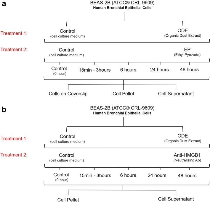 Methods: Rats were exposed to either ambient air or swine barn (8 h/day for either 1, 5, or 20 days) and lung tissues were processed for immunohistochemistry. Swine barn dust was collected and organic dust extract (ODE) was prepared and sterilized. Human airway epithelial cell line (BEAS-2B) was exposed to either media or organic dust extract followed by treatment with media or ethyl pyruvate (EP) or anti-HMGB1 antibody. Immunoblotting, ELISA and other assays were performed at 0 (control), 6, 24 and 48 h. Data (as mean ± SEM) was analyzed using one or two-way ANOVA followed by Bonferroni's post hoc comparison test. A p value of less than 0.05 was considered significant.