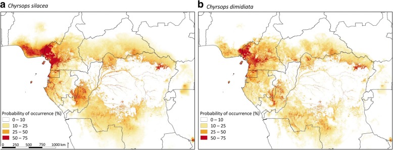 Background: Loiasis is caused by the filarial parasite Loa loa, which is widespread through Central and West Africa and largely confined the tropical equatorial rainforests. The tabanid flies Chrysops silacea and Chrysops dimidiata are the main vectors driving transmission. This study aimed to better define the spatial distribution and ecological niche of the two vectors to help define spatial-temporal risk and target appropriate, timely intervention strategies for filariasis control and elimination programmes.