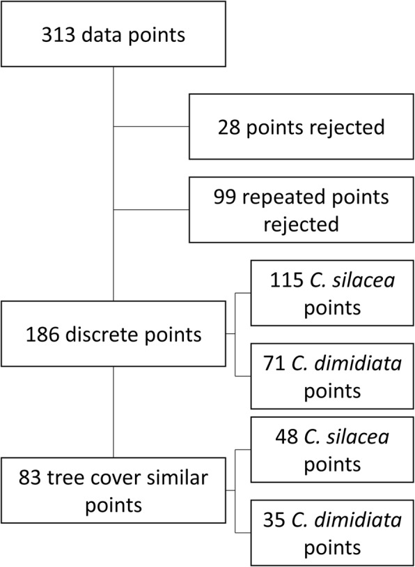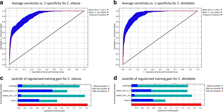 Results: A total of 313 location-specific data points from 59 published articles were identified across seven loiasis endemic countries. Of these, 186 sites were included in the climate and elevation analysis, and due to overt landcover changes, 83 sites included in tree canopy analysis and MaxEnt model. Overall, C. silacea and C. dimidiata were found to have similar ranges; annual mean temperature (24.6 °C and 24.1 °C, respectively), annual precipitation (1848.6 mm and 1868.8 mm), elevation (368.8 m and 400.6 m), tree canopy cover (61.4% and 66.9%) and tree canopy height (22.4 m and 25.1 m). MaxEnt models found tree canopy coverage was a significant environmental variable for both vectors.