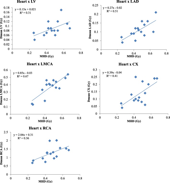 Results: Dose distributions were generated for 89 left-sided BC patients (MHD = 2.9 ± 1.5 Gy, Dmean_LAD = 15.7 ± 3.1 Gy) and 15 right-sided BC patients (MHD = 0.5 ± 0.1 Gy; Dmean_RCA = 1.2 ± 0.4 Gy). For left-sided BC patients, the ratio Dmean_LAD/MHD was around 5. Pearson correlation coefficients between MHD and Dmean for delineated substructures were all statistically significant. However, for all substructures, the coefficient of determination R2 indicated that the proportion of the variance in Dmean of the substructure predictable from MHD was moderate to low (in particular R2 = 0.45 for LAD). Among left-sided BC patients with MHD < 3Gy, 56% of patients could nevertheless receive LAD doses above 40Gy (V40 > 0).