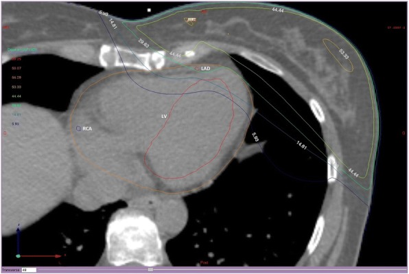 Methods: Data were collected from the BACCARAT prospective study that included left or right unilateral BC patients treated with 3D-Conformal Radiotherapy (RT) between 2015 and 2017 and followed-up for 2 years with repeated cardiac imaging examinations. A coronary computed tomography angiography (CCTA) was performed before RT for all patients. Registration of the planning CT and CCTA images allowed delineation of the coronary arteries on the planning CT images. Using the 3D dose matrix generated during treatment planning and the added coronary contours, dose distributions were generated for whole heart and the following substructures: left ventricle (LV), left main coronary artery (LMCA), left anterior descending artery (LAD), left circumflex artery (LCX) and right coronary artery (RCA). A descriptive analysis of the physical doses in Gray (Gy) was performed, Dmean was the volume-weighted mean dose.