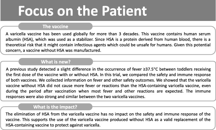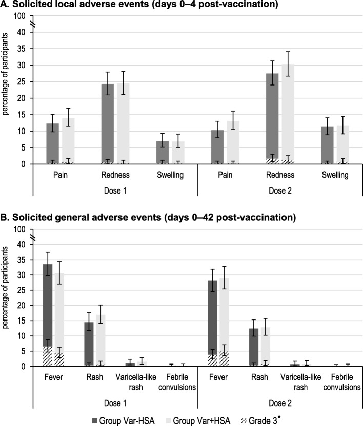 Results: Six hundred fifteen children in the Var-HSA group and 616 in the Var + HSA group received ≥1 vaccination. Fever > 39.0 °C was reported in 3.9 and 5.2% of participants in the Var-HSA and Var + HSA groups, with a between-group difference of - 1.29 (95% confidence interval: - 3.72-1.08); therefore, the primary objective was achieved. Fever rates post-each dose and the incidence of solicited local and general adverse events (AEs) were comparable between groups. Unsolicited AEs were reported for 43.9 and 36.5% of children in the Var-HSA group and 45.8 and 36.0% of children in the Var + HSA group, during 43 days post-dose 1 and 2, respectively. Serious AEs occurred in 2.1% (group Var-HSA) and 2.4% (group Var + HSA) of children, throughout the study. In a sub-cohort of 364 children, all had anti-varicella-zoster virus antibody concentrations ≥50 mIU/mL post-dose 2; comparable geometric mean concentrations were observed between the groups.