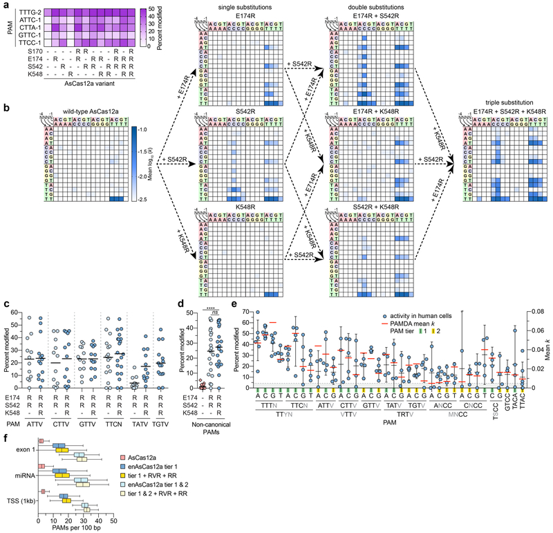 Broad use of CRISPR-Cas12a (formerly Cpf1) nucleases1 has been hindered by the requirement for an extended TTTV protospacer adjacent motif (PAM)2. To address this limitation, we engineered an enhanced Acidaminococcus sp. Cas12a variant (enAsCas12a) that has a substantially expanded targeting range, enabling targeting of many previously inaccessible PAMs. On average, enAsCas12a exhibits a twofold higher genome editing activity on sites with canonical TTTV PAMs compared to wild-type AsCas12a, and we successfully grafted a subset of mutations from enAsCas12a onto other previously described AsCas12a variants3 to enhance their activities. enAsCas12a improves the efficiency of multiplex gene editing, endogenous gene activation and C-to-T base editing, and we engineered a high-fidelity version of enAsCas12a (enAsCas12a-HF1) to reduce off-target effects. Both enAsCas12a and enAsCas12a-HF1 function in HEK293T and primary human T cells when delivered as ribonucleoprotein (RNP) complexes. Collectively, enAsCas12a provides an optimized version of Cas12a that should enable wider application of Cas12a enzymes for gene and epigenetic editing.