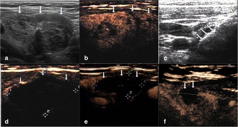 Methods: This retrospective study evaluated 194 non-functioning solid benign TNs of 103 patients. The TNs were categorized as small (≤5 ml), medium (5.1 to 13 ml), intermediate (13.1 to 30 ml) and large (over 30 ml) according to the initial volume of TNs before ablation. Clinical evaluation and contrast-enhanced ultrasound (CEUS) were carried out before ablation and the follow up at 1, 3, 6 months and every 6 months after ablation. All patients were asked to assess the cosmetic score (1-4 scores) and symptom score (0-10 scores) before ablation and every follow up after ablation.