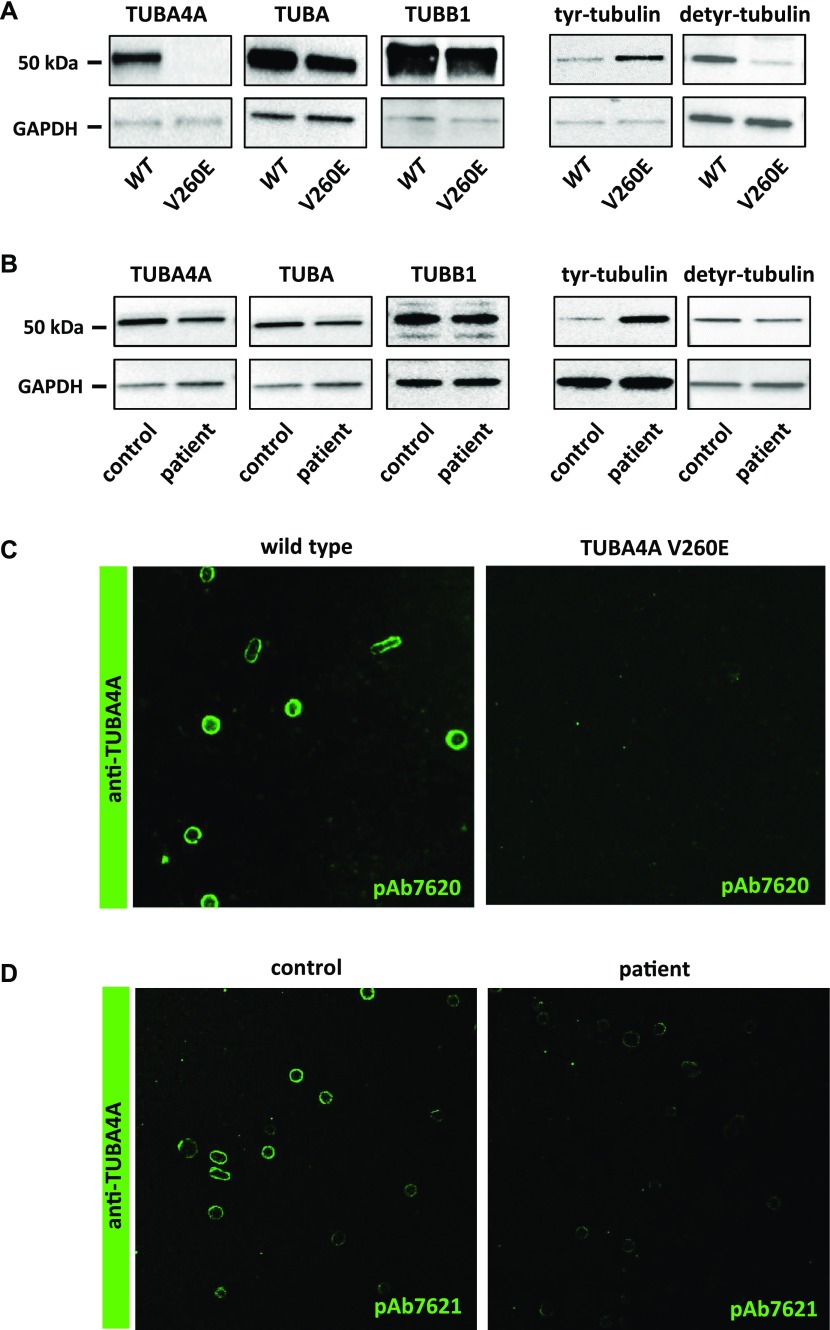 During platelet biogenesis, microtubules (MTs) are arranged into submembranous structures (the marginal band) that encircle the cell in a single plane. This unique MT array has no equivalent in any other mammalian cell, and the mechanisms responsible for this particular mode of assembly are not fully understood. One possibility is that platelet MTs are composed of a particular set of tubulin isotypes that carry specific posttranslational modifications. Although β1-tubulin is known to be essential, no equivalent roles of α-tubulin isotypes in platelet formation or function have so far been reported. Here, we identify α4A-tubulin as a predominant α-tubulin isotype in platelets. Similar to β1-tubulin, α4A-tubulin expression is up-regulated during the late stages of megakaryocyte differentiation. Missense mutations in the α4A-tubulin gene cause macrothrombocytopenia in mice and humans. Defects in α4A-tubulin lead to changes in tubulin tyrosination status of the platelet tubulin pool. Ultrastructural defects include reduced numbers and misarranged MT coils in the platelet marginal band. We further observed defects in megakaryocyte maturation and proplatelet formation in Tuba4a-mutant mice. We have, thus, discovered an α-tubulin isotype with specific and essential roles in platelet biogenesis.