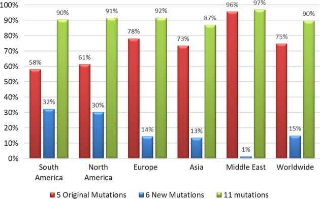 To date, 70 different TGFBI mutations that cause epithelial-stromal corneal dystrophies have been described. At present one commercially available test examines for the five most common of these mutations: R124H, R124C, R124L, R555W, and R555Q. To expand the capability of identifying the causative mutation in the remaining cases, 57 mutations would need to be added. The aim of this study was to obtain a better understanding of the worldwide distribution and population differences of TGFBI mutations and to assess which mutations could be included or excluded from any potential assay. A total of 184 published papers in Human Gene Mutation Database (HGMD) and PubMed from 34 countries worldwide reporting over 1600 corneal dystrophy cases were reviewed. Global data from 600,000 samples using the commercially available test were analyzed. Case studies by University College of London (UCL), Moorfield's Corneal Dystrophy Study data and 19 samples from patients with clinical abnormality or uncertainty for which the current test detected no mutation were used to predict an achievable detection rate. Data from the literature search showed no difference in the spectrum and frequency of each mutation in different populations or geographical locations. According to our analysis, an increase to the worldwide detection rate in all populations from 75 to 90% could be achieved by the addition of six mutations-H626R, A546D, H572R, G623D, R124S, and M502V-to the currently available test and that may be beneficial for LASIK pre-screening worldwide.