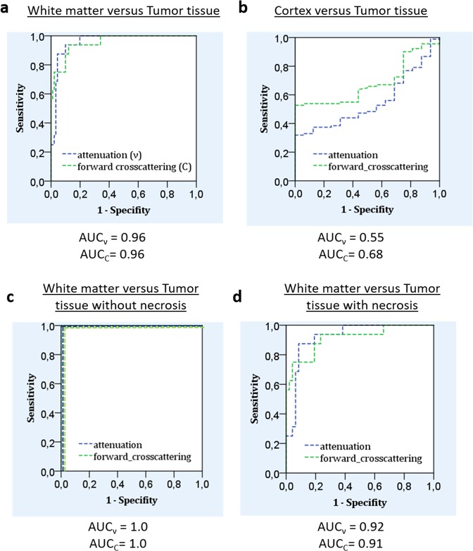 Optical coherence tomography (OCT) is a promising method for detecting cancer margins during tumor resection. This study focused on differentiating tumorous from nontumorous tissues in human brain tissues using cross-polarization OCT (CP OCT). The study was performed on fresh ex vivo human brain tissues from 30 patients with high- and low-grade gliomas. Different tissue types that neurosurgeons should clearly distinguish during surgery, such as the cortex, white matter, necrosis and tumorous tissue, were separately analyzed. Based on volumetric CP OCT data, tumorous and normal brain tissue were differentiated using two optical coefficients - attenuation and forward cross-scattering. Compared with white matter, tumorous tissue without necrotic areas had significantly lower optical attenuation and forward cross-scattering values. The presence of particular morphological patterns, such as necrosis and injured myelinated fibers, can lead to dramatic changes in coefficient values and create some difficulties in differentiating between tissues. Color-coded CP OCT maps based on optical coefficients provided a visual assessment of the tissue. This study demonstrated the high translational potential of CP OCT in differentiating tumorous tissue from white matter. The clinical use of CP OCT during surgery in patients with gliomas could increase the extent of tumor resection and improve overall and progression-free survival.