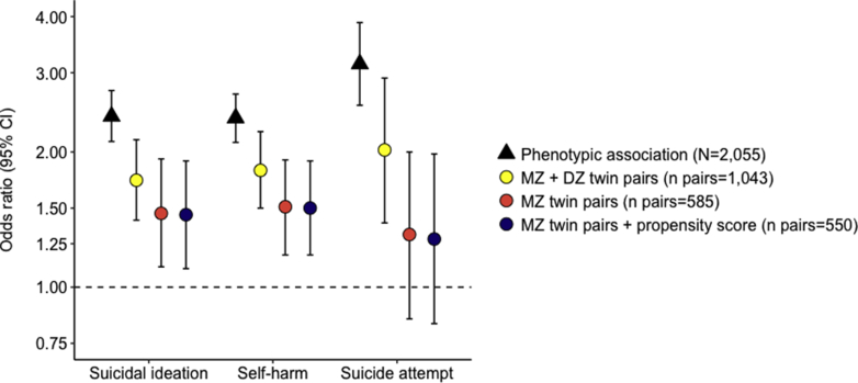 Results: Victimized adolescents had an increased risk of suicidal ideation (odds ratio [OR] 2.40, 95% CI 2.11-2.74), self-harm (OR 2.38, 95% CI 2.10-2.69), and suicide attempt (OR 3.14, 95% CI 2.54-3.88). Co-twin control and propensity score matching analyses showed that these associations were largely accounted for by pre-existing familial and individual vulnerabilities, respectively. Over and above their prior vulnerabilities, victimized adolescents still showed a modest increase in risk for suicidal ideation (OR 1.45, 95%CI 1.10-1.91) and self-harm (OR 1.50, 95% CI 1.18-1.91) but not for suicide attempt (OR 1.28, 95% CI 0.83-1.98).