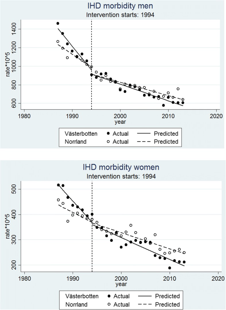 Background: Cardiovascular disease (CVD) is the main cause of morbidity and mortality in Sweden. This study aims to assess the impact of a CVD intervention implemented in 1993 in northern Sweden on the reduction of premature ischemic heart disease (IHD) morbidity and mortality in women and men during the period 1987-2013.