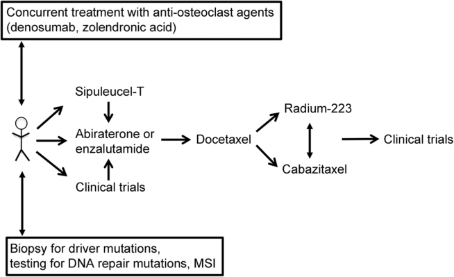 Metastatic prostate cancer patients present in two ways-with already disseminated disease at the time of presentation or with disease recurrence after definitive local therapy. Androgen deprivation therapy is given as the most effective initial treatment to patients. However, after the initial response, almost all patients will eventually progress despite the low levels of testosterone. Disease at this stage is termed castration resistant prostate cancer (CRPC). Before 2010, the taxane docetaxel was the first and only life prolonging agent for metastatic CRPC (mCRPC). The last decade has witnessed robust progress in CRPC therapeutics development. Abiraterone, enzalutamide, apalutamide and sipuleucel-T have been evaluated as first- and second-line agents in mCRPC patients, while cabazitaxel was approved as a second-line treatment. Radium-223 dichloride was approved in symptomatic patients with bone metastases and no known visceral metastases pre- and post-docetaxel. However, despite significant advances, mCRPC remains a lethal disease. Both primary and acquired resistance have been observed in CRPC patients treated by these new agents. It could be solely cell intrinsic or it is possible that the clonal heterogeneity in treated tumors may result from the adaptive responses to the selective pressures within the tumor microenvironment. The aim of this review is to list current treatment agents of CRPC and summarize recent findings in therapeutic resistance mechanisms.