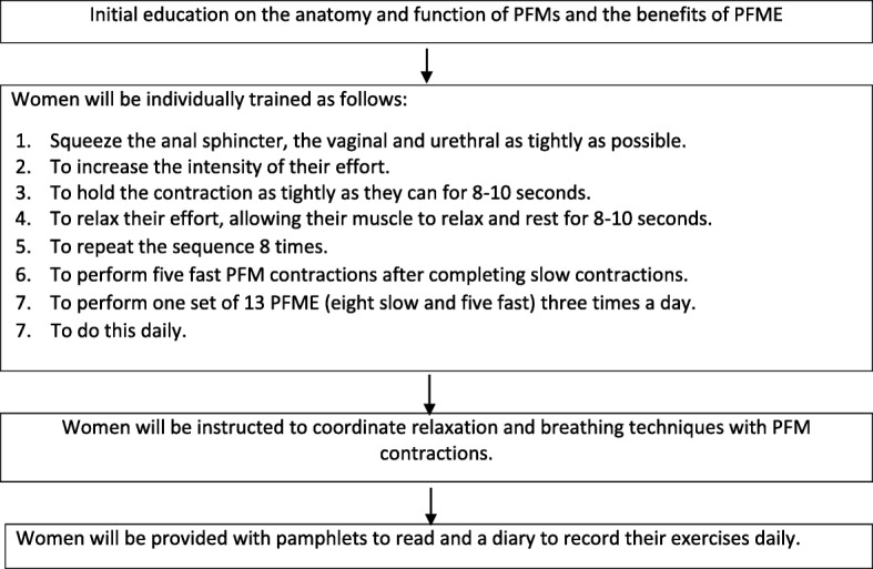 Discussion: The findings of this study will provide more information on whether a hospital-based antenatal PFME has any effect on female SF, urinary and faecal incontinence during pregnancy and the first 3 months following birth. The study will also provide information on the effectiveness of antenatal PFME on childbirth outcomes.