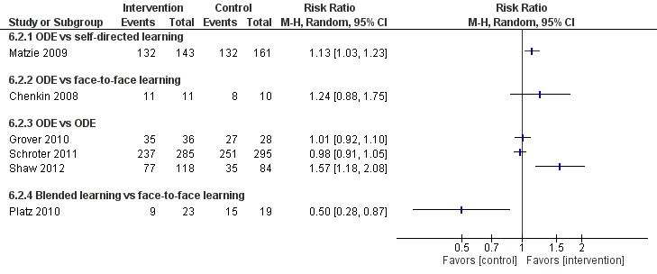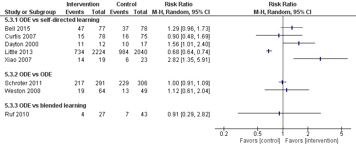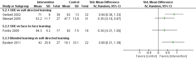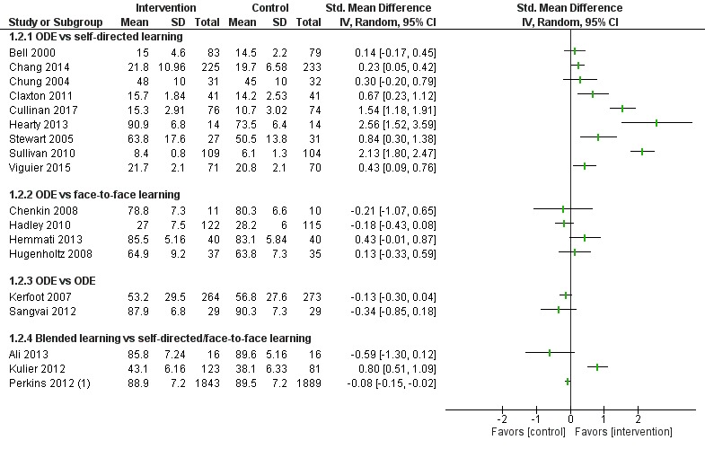 Methods: We searched seven electronic databased for randomized controlled trials, cluster-randomized trials, and quasi-randomized trials from January 1990 to March 2017. Two review authors independently extracted data and assessed the risk of bias. We have presented the findings narratively. We mainly compared ODE with self-directed/face-to-face learning and blended learning with self-directed/face-to-face learning.