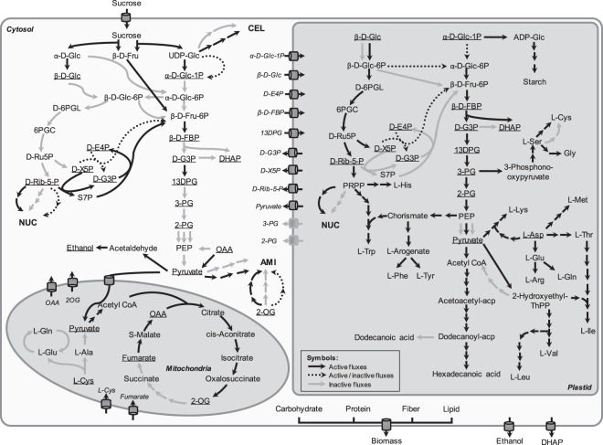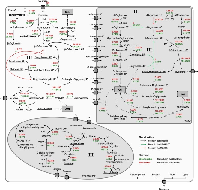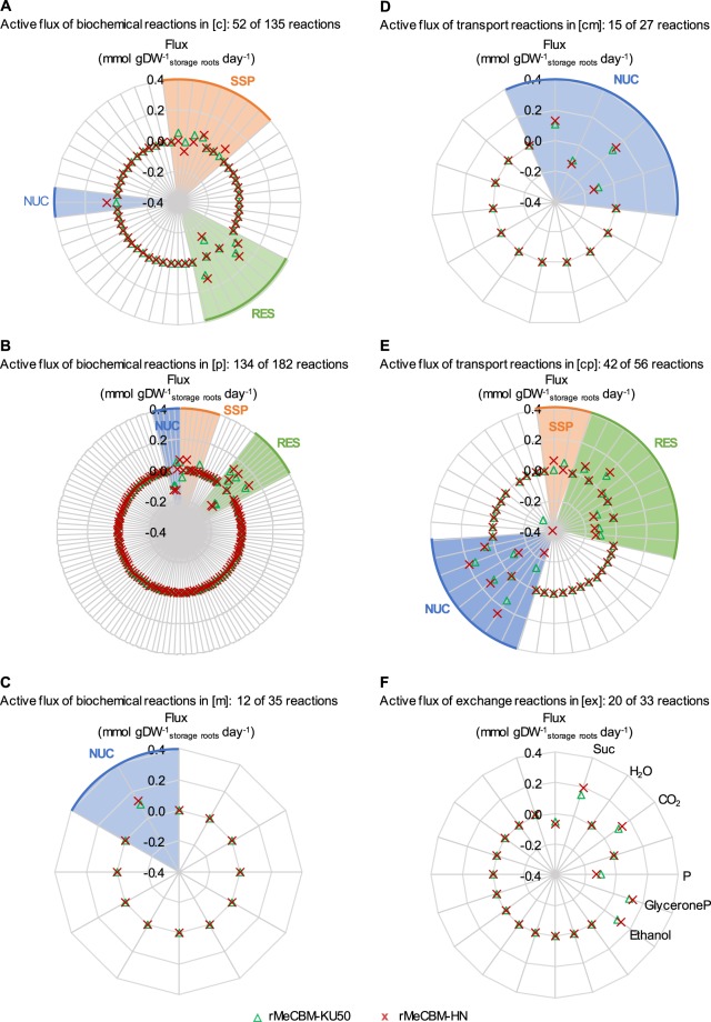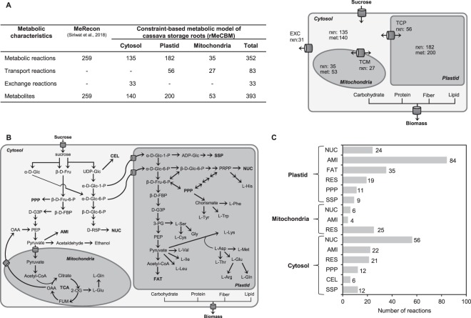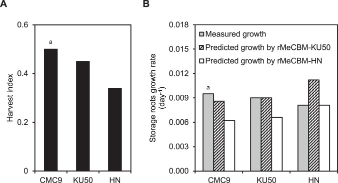 Analysis of metabolic flux was used for system level assessment of carbon partitioning in Kasetsart 50 (KU50) and Hanatee (HN) cassava cultivars to understand the metabolic routes for their distinct phenotypes. First, the constraint-based metabolic model of cassava storage roots, rMeCBM, was developed based on the carbon assimilation pathway of cassava. Following the subcellular compartmentalization and curation to ensure full network connectivity and reflect the complexity of eukaryotic cells, cultivar specific data on sucrose uptake and biomass synthesis were input, and rMeCBM model was used to simulate storage root growth in KU50 and HN. Results showed that rMeCBM-KU50 and rMeCBM-HN models well imitated the storage root growth. The flux-sum analysis revealed that both cultivars utilized different metabolic precursors to produce energy in plastid. More carbon flux was invested in the syntheses of carbohydrates and amino acids in KU50 than in HN. Also, KU50 utilized less flux for respiration and less energy to synthesize one gram of dry storage root. These results may disclose metabolic potential of KU50 underlying its higher storage root and starch yield over HN. Moreover, sensitivity analysis indicated the robustness of rMeCBM model. The knowledge gained might be useful for identifying engineering targets for cassava yield improvement.