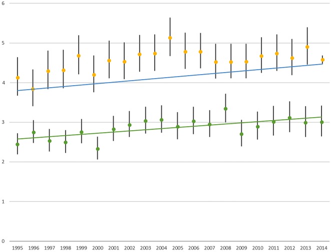 Results: The SMR of patients with SMI was significantly higher than one for each calendar year in the study period with an overall SMR of 4.58, 95% CI (4.48-4.69) in patients diagnosed with schizophrenia (n = 38,500) and of 2.57 (95% CI 2.49-2.65) in patients diagnosed with bipolar disorder (n = 23,092). When investigating time trends in SMR for schizophrenia and for bipolar disorder, respectively, an increase in SMR over time was shown with a mean increase of 0.03 per year for schizophrenia and 0.02 for bipolar disorder (p < 0.01 for both disorders). The ratio between SMR for schizophrenia and SMR for bipolar disorder for each calendar year over the study period was constant (p = 0.756).