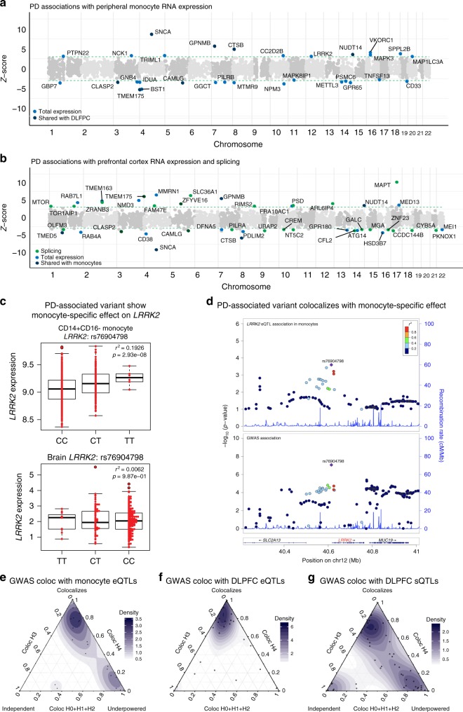 Genome-wide association studies (GWAS) have identified over 41 susceptibility loci associated with Parkinson's Disease (PD) but identifying putative causal genes and the underlying mechanisms remains challenging. Here, we leverage large-scale transcriptomic datasets to prioritize genes that are likely to affect PD by using a transcriptome-wide association study (TWAS) approach. Using this approach, we identify 66 gene associations whose predicted expression or splicing levels in dorsolateral prefrontal cortex (DLFPC) and peripheral monocytes are significantly associated with PD risk. We uncover many novel genes associated with PD but also novel mechanisms for known associations such as MAPT, for which we find that variation in exon 3 splicing explains the common genetic association. Genes identified in our analyses belong to the same or related pathways including lysosomal and innate immune function. Overall, our study provides a strong foundation for further mechanistic studies that will elucidate the molecular drivers of PD.