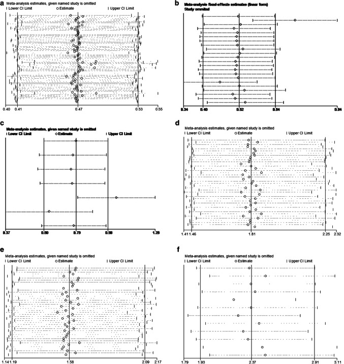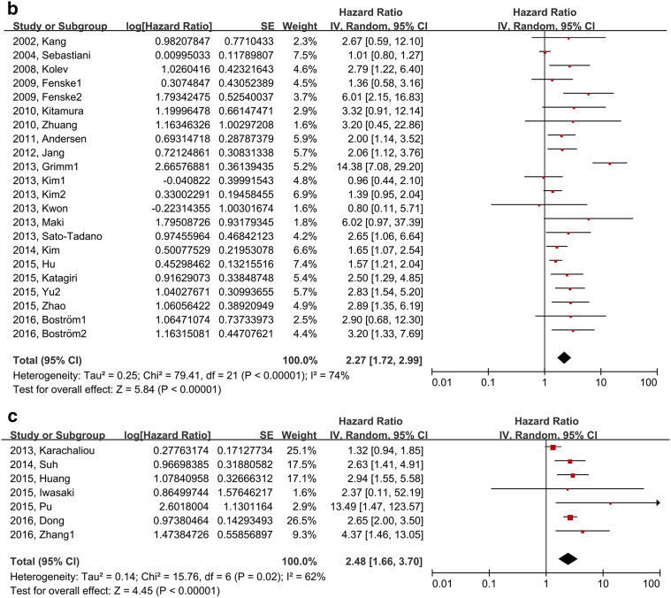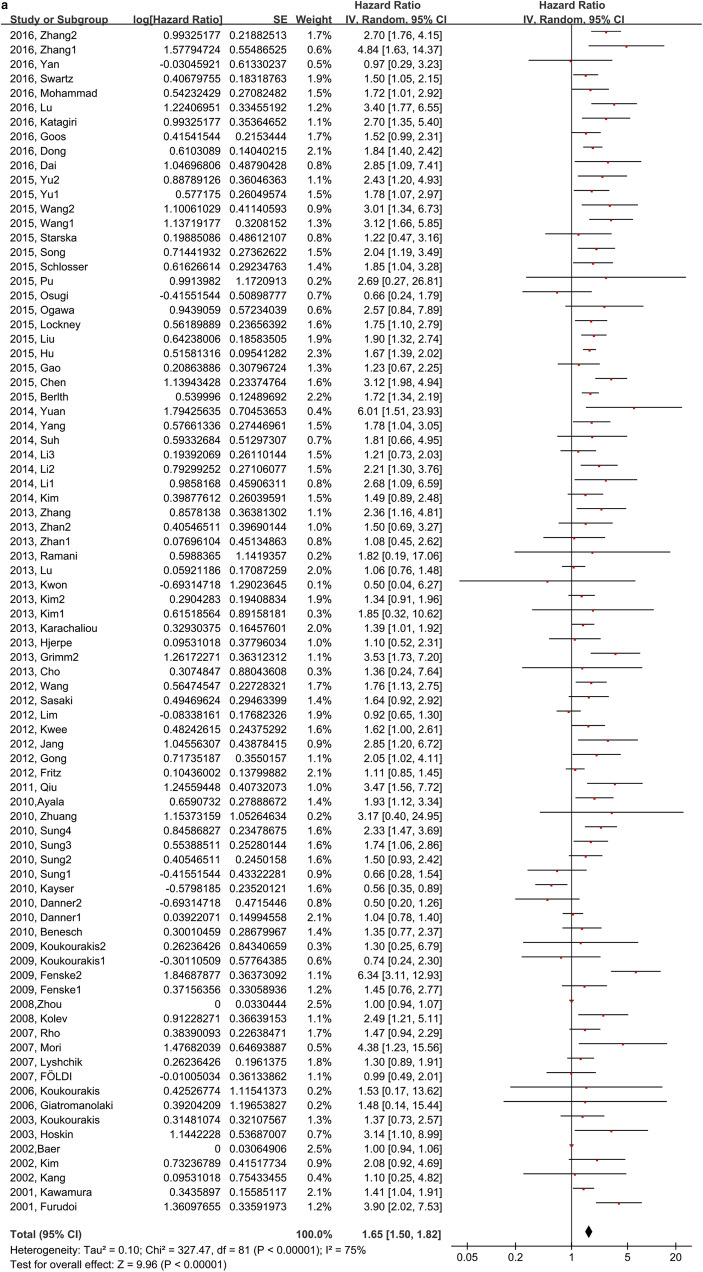 Results: Our pooled results identified that glycolysis-related proteins in cancers were associated with shorter overall survival of colorectal cancer (HR 2.33, 95% CI 1.38-3.93, P = 0.002), gastric cancer (HR 1.55, 95% CI 1.31-1.82, P < 0.001), cancer of gallbladder or bile duct (HR 2.16, 95% CI 1.70-2.75, P < 0.001), oral cancer (HR 2.07, 95% CI 1.32-3.25, P < 0.001), esophageal cancer (HR 1.66, 95% CI 1.25-2.21, P = 0.01), hepatocellular carcinoma (HR 2.04, 95% CI 1.64-2.54, P < 0.001), pancreatic cancer (HR 1.72, 95% CI 1.39-2.13, P < 0.001), breast cancer(HR 1.67, 95% CI 1.34-2.08, P < 0.001), and nasopharyngeal carcinoma (HR 3.59, 95% CI 1.75-7.36, P < 0.001). No association was found for lung cancer, ovarian cancer or melanoma. The key glycolytic transcriptional regulators (HIF-1α, p53) were analyzed in parallel to the glycolysis-related proteins, and the pooled results identified that high-level expression of HIF-1α was significantly associated with shorter overall survival (HR 0.57, 95% CI 0.42-0.79, P < 0.001) Furthermore, glycolysis-related proteins linked with poor differentiated tumors (OR 1.81, 95% CI 1.46-2.25, P < 0.001), positive lymph node metastasis (OR 2.73, 95% CI 2.16-3.46, P < 0.001), positive vascular invasion (OR 2.05, 95% CI 1.37-3.07, P < 0.001), large tumor size (OR 2.06, 95% CI 1.80-2.37, P < 0.001), advanced tumor stage (OR 1.58, 95% CI 1.19-2.09, P < 0.001), and deeper invasion (OR 2.37, 95% CI 1.93-2.91, P < 0.001).