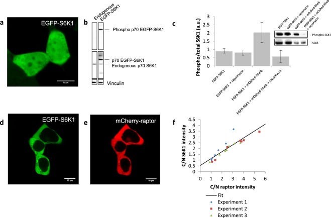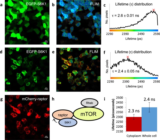 Knowledge of protein signalling pathways in the working cell is seen as a primary route to identifying and developing targeted medicines. In recent years there has been a growing awareness of the importance of the mTOR pathway, making it an attractive target for therapeutic intervention in several diseases. Within this pathway we have focused on S6 kinase 1 (S6K1), the downstream phosphorylation substrate of mTORC1, and specifically identify its juxtaposition with mTORC1. When S6K1 is co-expressed with raptor we show that S6K1 is translocated from the nucleus to the cytoplasm. By developing a novel biosensor we demonstrate in real-time, that phosphorylation and de-phosphorylation of S6K1 occurs mainly in the cytoplasm of living cells. Furthermore, we show that the scaffold protein raptor, that typically recruits mTOR substrates, is not always involved in S6K1 phosphorylation. Overall, we demonstrate how FRET-FLIM imaging technology can be used to show localisation of S6K1 phosphorylation in living cells and hence a key site of action of inhibitors targeting mTOR phosphorylation.