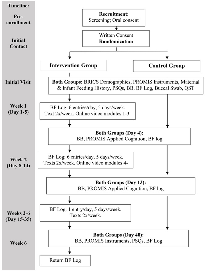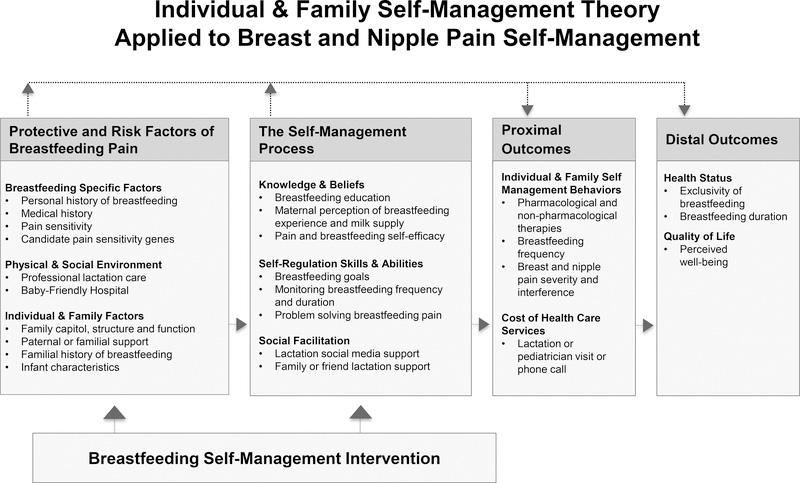 The majority of women experience pain during breastfeeding initiation with few strategies to manage breast and nipple pain. In fact, women cite breast and nipple pain as among the most common reasons for breastfeeding cessation. To address this important issue, we developed a breastfeeding self-management (BSM) intervention, based on the Individual and Family Self-Management Theory Framework. In this framework, self-management is conceptualized as a process in which women use knowledge, beliefs, and social facilitation to achieve breastfeeding goals. The purpose of this longitudinal pilot randomized controlled trial was to test the feasibility, acceptability, and preliminary efficacy of the BSM intervention with women initiating breastfeeding. Recruitment of 60 women intending to breastfeed occurred within 48 hr of delivery and women were randomized to either the intervention or usual care group. The BSM intervention group received BSM education modules that included information of how to manage breast and nipple pain and self-management support through biweekly texting from the study nurse, and were asked to complete a daily breastfeeding journal. Primary outcomes measured at baseline, 1, 2, and 6 weeks will be used to (a) evaluate feasibility, acceptability, and preliminary efficacy of the BSM intervention, and (b) assess the influence of protective and risk factors of breastfeeding pain (including individual genetic polymorphisms related to pain sensitivity) on process variables for self-management of breastfeeding and breastfeeding pain, and on proximal (breastfeeding pain severity and interference, breastfeeding frequency) and distal outcomes (breastfeeding exclusivity and duration and general well-being).