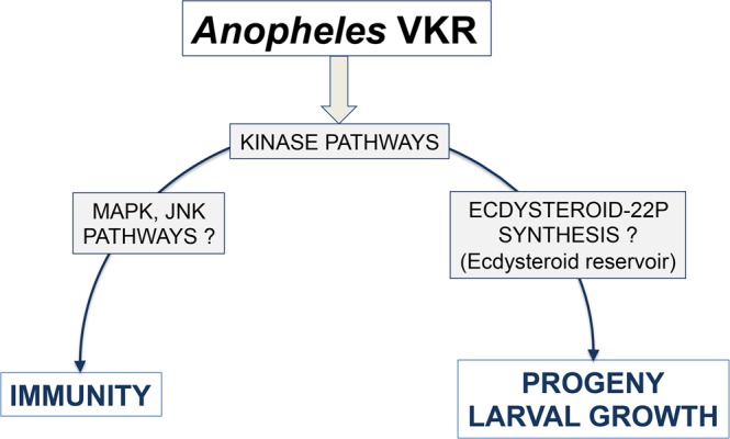 Vector-borne diseases and especially malaria are responsible for more than half million deaths annually. The increase of insecticide resistance in wild populations of Anopheles malaria vectors emphasises the need for novel vector control strategies as well as for identifying novel vector targets. Venus kinase receptors (VKRs) constitute a Receptor Tyrosine Kinase (RTK) family only found in invertebrates. In this study we functionally characterized Anopheles VKR in the Gambiae complex member, Anopheles coluzzii. Results showed that Anopheles VKR can be activated by L-amino acids, with L-arginine as the most potent agonist. VKR was not required for the fecundity of A. coluzzii, in contrast to reports from other insects, but VKR function is required in both Anopheles males and females for development of larval progeny. Anopheles VKR function is also required for protection against infection by Plasmodium parasites, thus identifying a novel linkage between reproduction and immunity in Anopheles. The insect specificity of VKRs as well as the essential function for reproduction and immunity suggest that Anopheles VKR could be a potentially druggable target for novel vector control strategies.