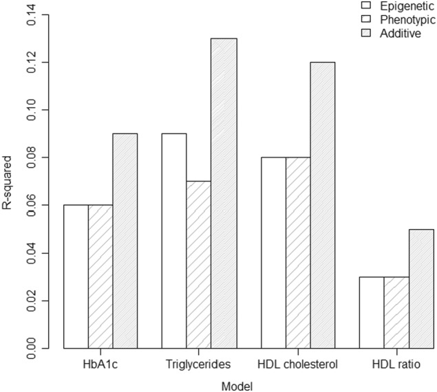 Results: A higher epigenetic BMI score was associated with higher BMI (R2 = 0.1), greater body weight (R2 = 0.06), greater time taken to walk 6 m, poorer lung function and poorer general physical health (all R2 = 0.02), greater levels of triglycerides (R2 = 0.09), greater %total HbA1c (R2 = 0.06), lower levels of high-density lipoprotein cholesterol (HDL; R2 = 0.08), higher HDL ratio (HDL/total cholesterol; R2 = 0.03), lower health-related quality of life, physical inactivity, and greater social deprivation (all R2 = 0.02). The epigenetic BMI score (per SD) was also associated with type 2 diabetes (OR 2.17, 95% CI 1.67, 2.84), cardiovascular disease (OR 1.45, 95% CI 1.24, 1.71) and high blood pressure (OR 1.30, 95% CI 1.13, 1.49; all p < 0.00026 after Bonferroni correction). Associations were replicated for BMI (R2 = 0.06), body weight (R2 = 0.04), health-related quality of life (R2 = 0.02), HbA1c (R2 = 0.07) and triglycerides (R2 = 0.07; all p < 0.0045 after Bonferroni correction).