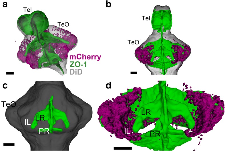 Results: Taking advantage of genetic lineage-tracing techniques in zebrafish, we reveal that cells originating from her5-expressing progenitors in the midbrain-hindbrain boundary (MHB) participate in the formation of a large part of the IL. 3D visualization demonstrated how IL develops in relation to the ventricular system. We found that IL is constituted by two developmental components: the periventricular zone of hypothalamic origin and the external zone of mesencephalic origin. The mesencephalic external zone grows progressively until adulthood by adding new cells throughout development.