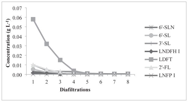 The purification of caprine milk oligosaccharides (COS) by membrane filtration has been hampered by the low concentration of target COS and high concentration of lactose. In addition, their molecular weight proximity hinders the recovery of a COS fraction with high degree of purity and recovery yield. In this work, the recovery of a high purity COS concentrate was obtained by the optimization of an integrated approach including complete lactose hydrolysis, fermentation of the resulting monosaccharides and nanofiltration. All carbohydrates were quantified using High Performance Anion Exchange Chromatography with Pulsed Amperometric Detection (HPAEC PAD). Defatted goat whey was ultrafiltered with discontinuous diafiltrations to increase the recovery of COS in the whey permeate which was then subsequently concentrated by nanofiltration. COS recovery yields of 75% with negligible amounts of monosaccharides (0.3% of the initial amount of lactose in the whey permeate) were achieved. A final retentate containing 67.6 and 34.4% of acidic and neutral oligosaccharides respectively was obtained from caprine milk.