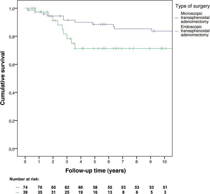 Results: Of 137 included patients, 87 were treated microscopically and 50 endoscopically. Three months after microscopic surgery, 74 patients (86%) were in remission. Five-year recurrence-free survival was 89% (95% confidence interval [CI]: 82-96%), and ten-year recurrence free survival was 84% (95% CI: 75-93%). After endoscopic surgery, 39 patients (83%) were in remission. Both five-year and ten-year recurrence-free survival were 71% (95% CI: 55-87%). Hazard ratio for recurrence was 0.47 (95% CI: 0.19-1.14), and for mortality 2.79 (95% CI: 0.35-22.51), for microscopic versus endoscopic surgery. No learning curve was found for endoscopy, nor an influence of preoperative imaging technique for microscopy. In addition, we did not find a clear relation between the surgeons' intraoperative findings and surgical outcomes.